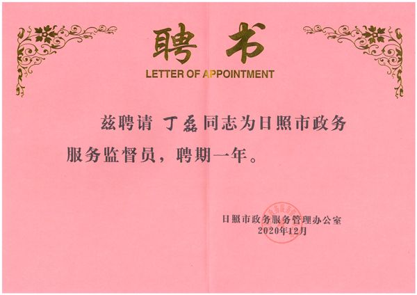 2020年12月3日,日照市政府服務(wù)管理辦公室、日照市行政審批服務(wù)局舉行日照市政務(wù)服務(wù)監(jiān)督員聘任儀式及政府開放日活動(dòng),公司董事、行政總監(jiān)丁磊被聘為日照市政務(wù)服務(wù)監(jiān)督員。