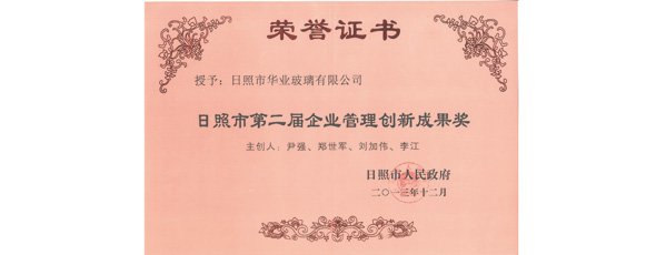 華業(yè)玻璃被日照市人民政府授予“日照市第二屆企業(yè)管理創(chuàng)新成果獎”