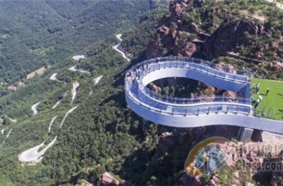 2018年6月12日,河南省新密市,經(jīng)過8個月的建設(shè),伏羲山旅游區(qū)的懸空玻璃環(huán)廊正式落成,游人走在環(huán)廊上感受“天空漫步”的刺激體驗。據(jù)了解,伏羲山玻璃環(huán)廊將于6月16日起對外開放,該橋采用無斜拉索設(shè)計,整體工程用鋼量超3000噸,橋面使用150塊三層鋼化夾膠玻璃鋪設(shè),距離峽谷地面360米,環(huán)廊伸出懸崖30米。比美國科羅拉多大峽谷號稱“世界第八大奇跡”的玻璃環(huán)廊還長出近9米,可謂是“世界很長的高空玻璃環(huán)廊”。